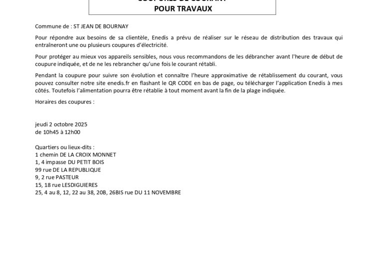 Une coupure de courant aura lieu : 📆 jeudi 2 octobre 2025 ⏰ de 10h45…