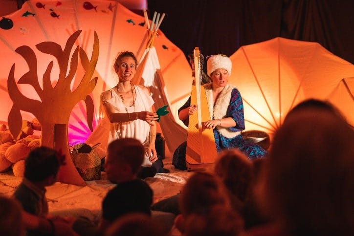 Au son d’une harpe, de danse et d’un florilège d’instruments du monde, les comédiennes créent une interaction malicieuse et poétique avec le public.
