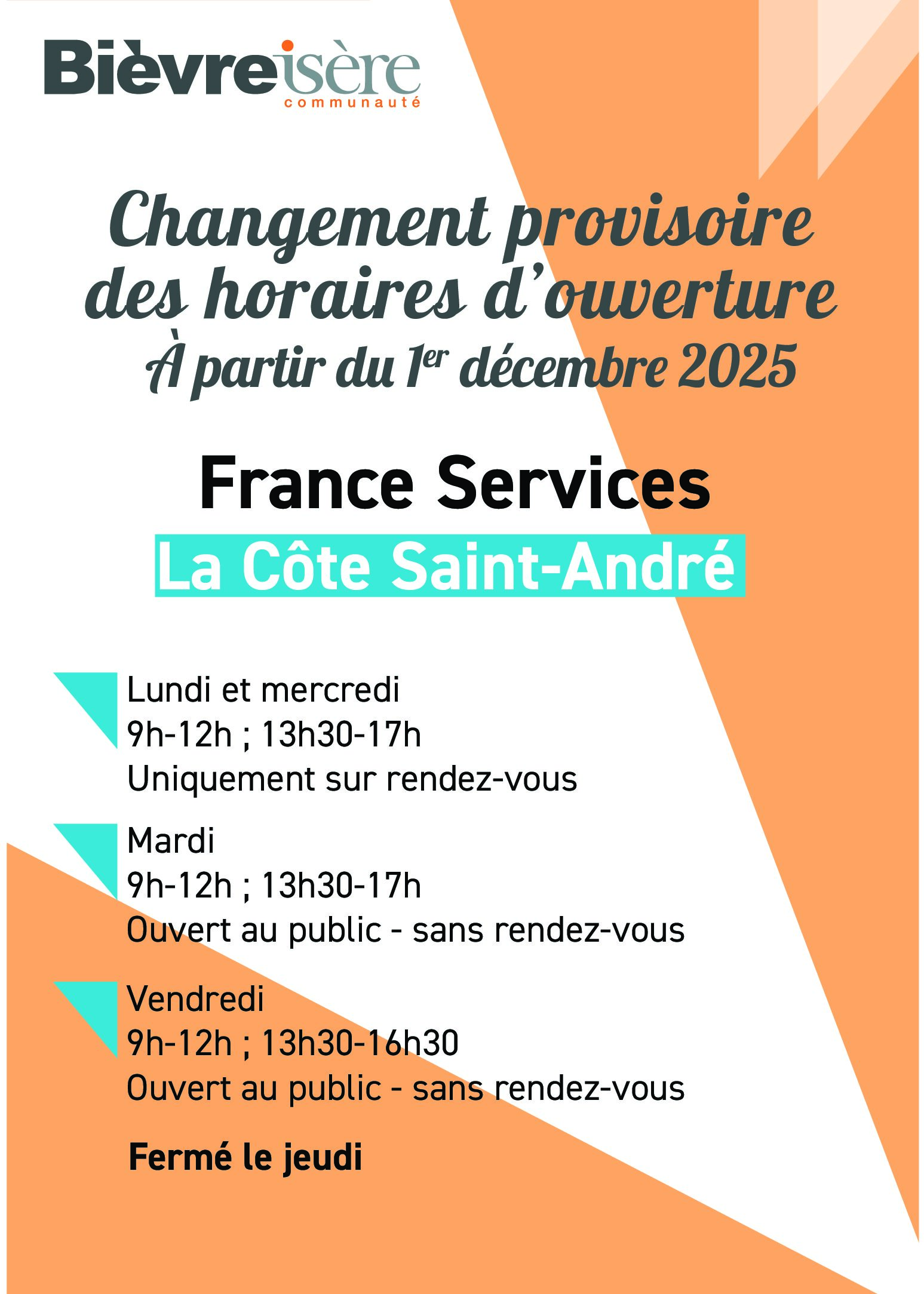 Vous trouverez ci-dessous les horaires d’ouverture de l’accueil Maison France Services à partir du 01 décembre 2025.