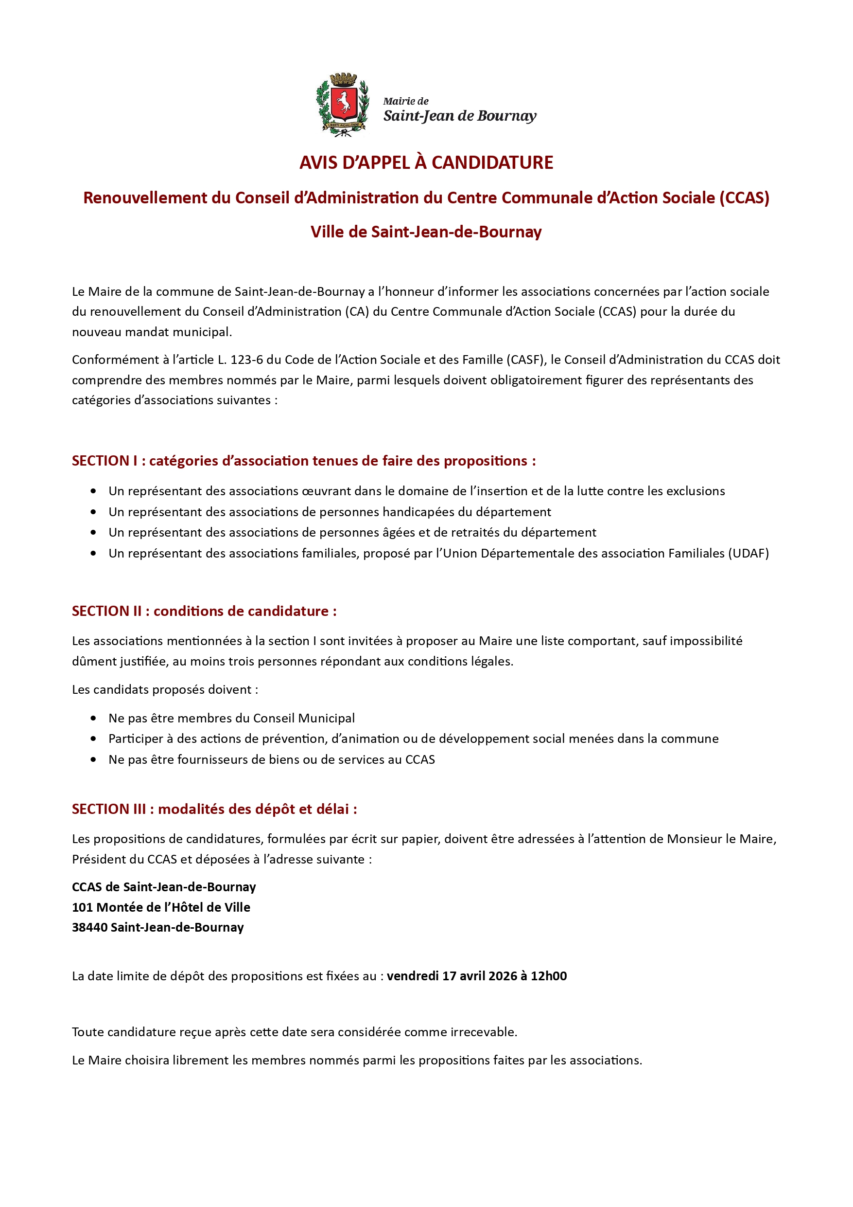 25 Mar Facebook Email Print Renouvellement du Conseil d’Administration du Centre Communale d’Action Sociale (CCAS) de la Ville de Saint-Jean-de-Bournay