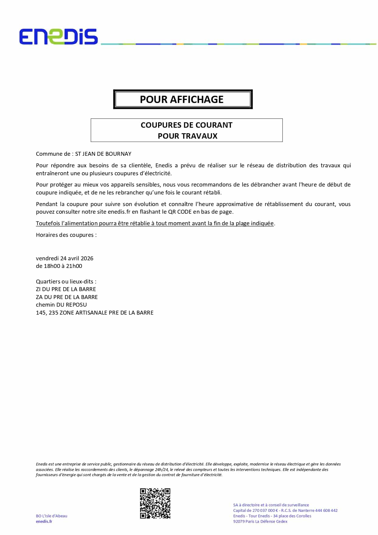 ENEDIS a prévu de réaliser sur le réseau de distribution des travaux qui entraineront une ou plusieurs coupures d’électricité :