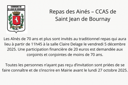 15 Oct non classé by AdminCom Repas des Ainés – CCAS de Saint Jean de Bournay Les Aînés de 70 ans et plus sont invités au traditionnel repas qui aura lieu…