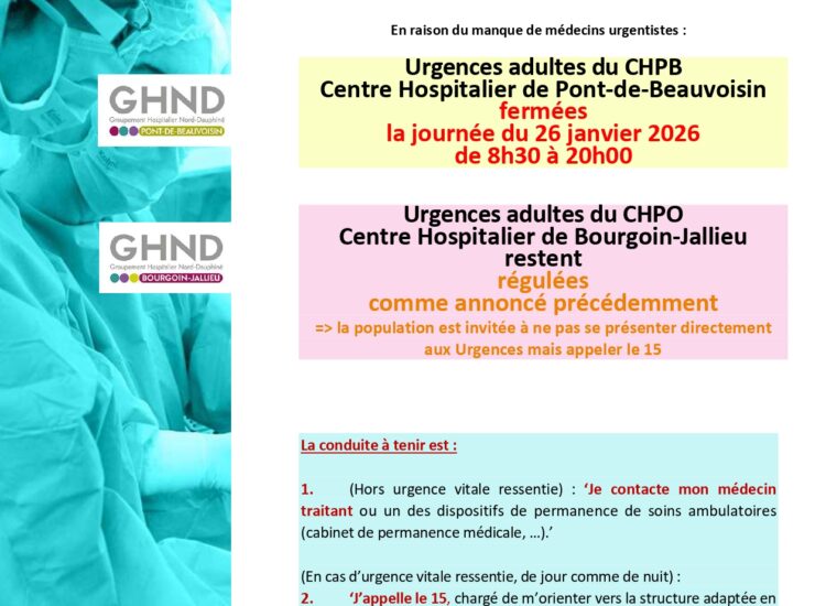 23 Jan non classé by AdminCom INFORMATION IMPORTANTE – Pont-de-Beauvoisin, Bourgoin-Jallieu Urgences adultes du Centre Hospitalier de Bourgoin-Jallieu régulées Urgences adultes du Centre Hospitalier de Pont-de-Beauvoisin…